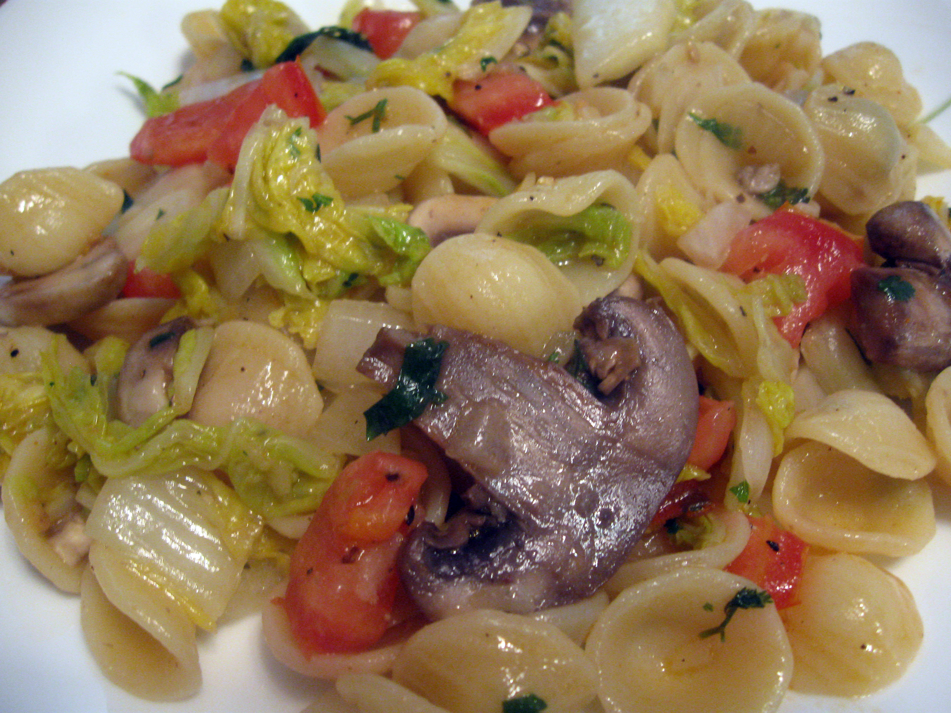 Orecciette Pasta Salad with Napa Cabbage, tomatoes, Mushrooms, Onions, and Herbs