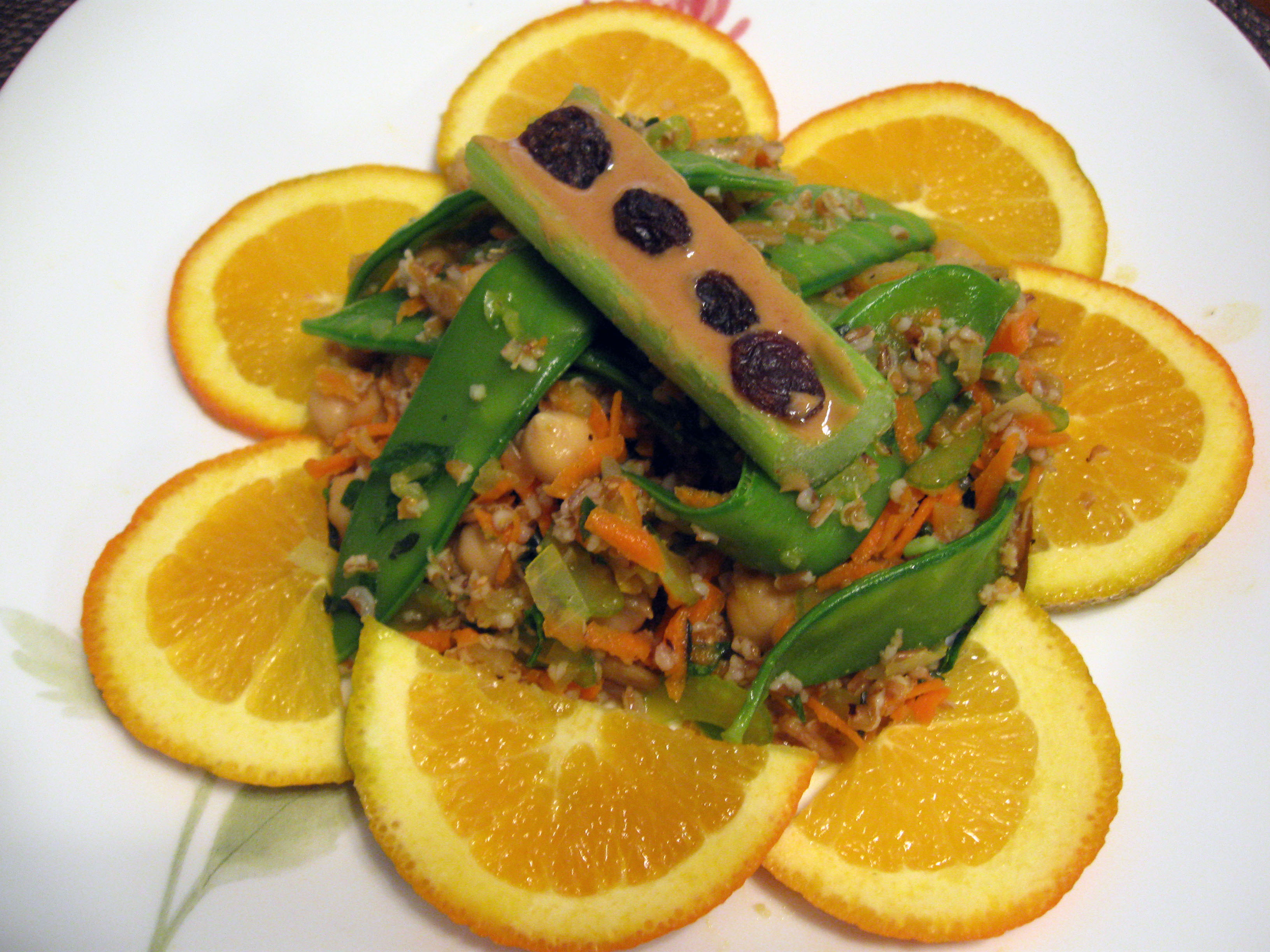 Today, I created a masterpiece vegan salad. The flavors are balanced and you can just feel the freshness, power, and energy with each bite. Here is the recipe and photo. The little celery stick on top with peanut butter and raisins is called Ants On A Log. This was created by one of my children.