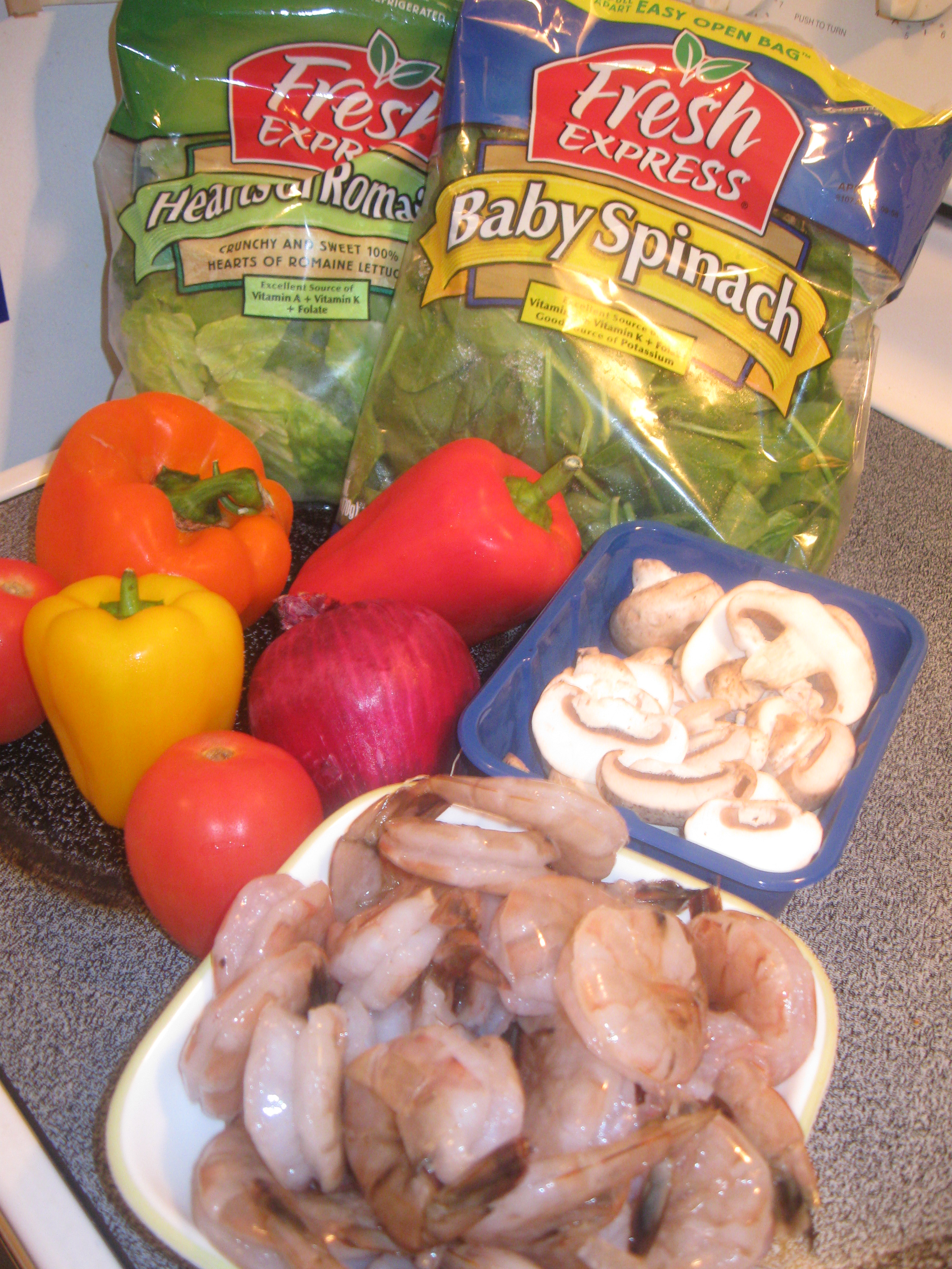 When eating salad, I am always amazed by the colors of vegetables available. You can truly create a rainbow of colors. This salad has spinach, romaine lettuce, mushrooms, red onion, tomato, red, yellow, and orange bell pepper. For the centerpiece, I have 16/20 size shrimp sauteed in garlic, olive oil, and lemon pepper. For the vegetarians out there, just drop the shrimp and come up with your own protein alternative.