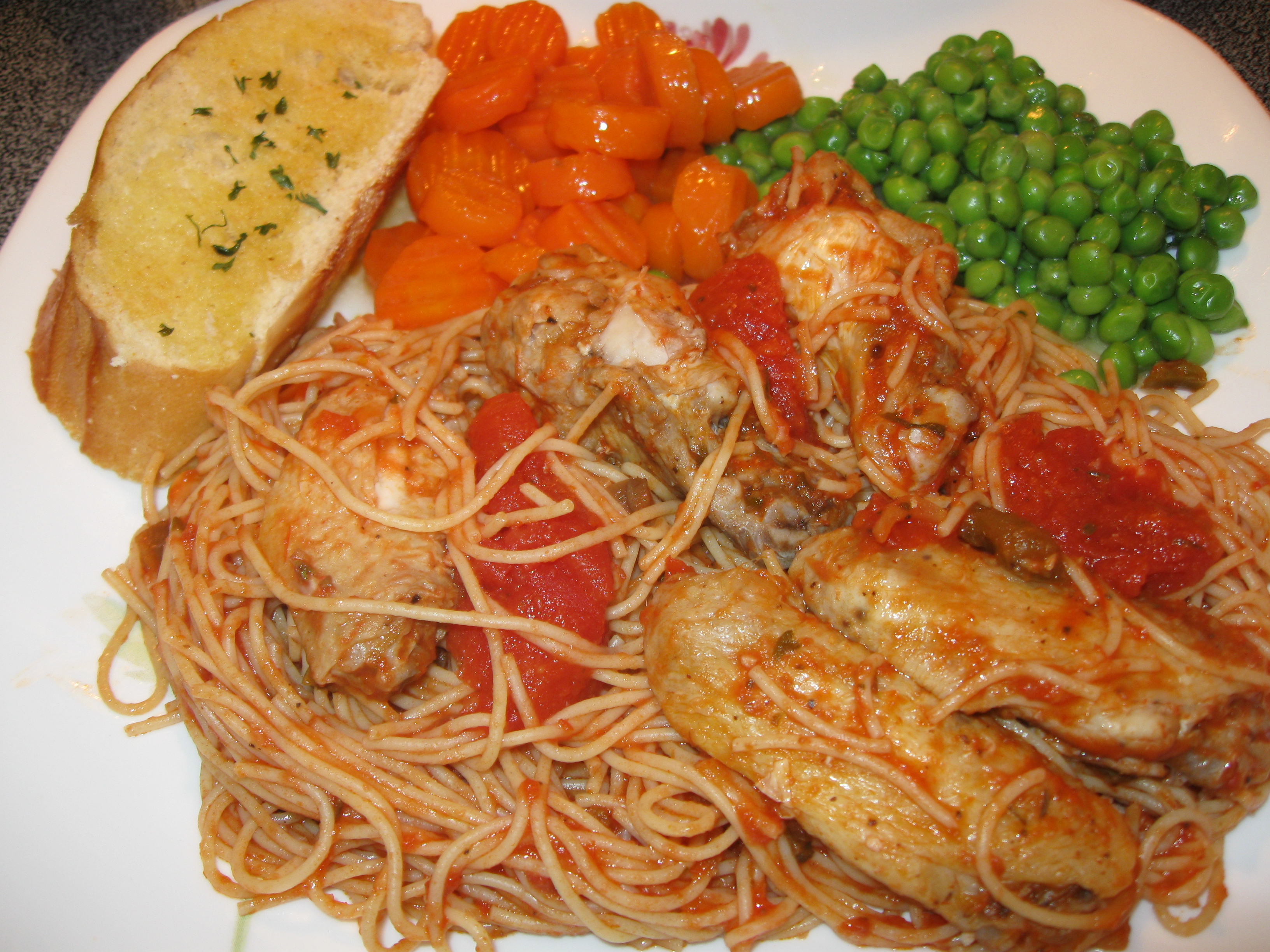 Season chicken with Slap Ya Mama Cajun seasoning. Spray a non-stick baking pan and bake chicken until juices run clear about 30 minutes. In another pan, add three tsp of oil and saute onion for two minutes. Add bell pepper and saute for four minutes. Add tomatoes, stewed tomatoes, crushed garlic, bay leaves, thyme, and simmer 20 minutes. Boil pasta according to package directions. Drain Pasta, top with sauce, and then baked chicken, and mix together. Enjoy!
